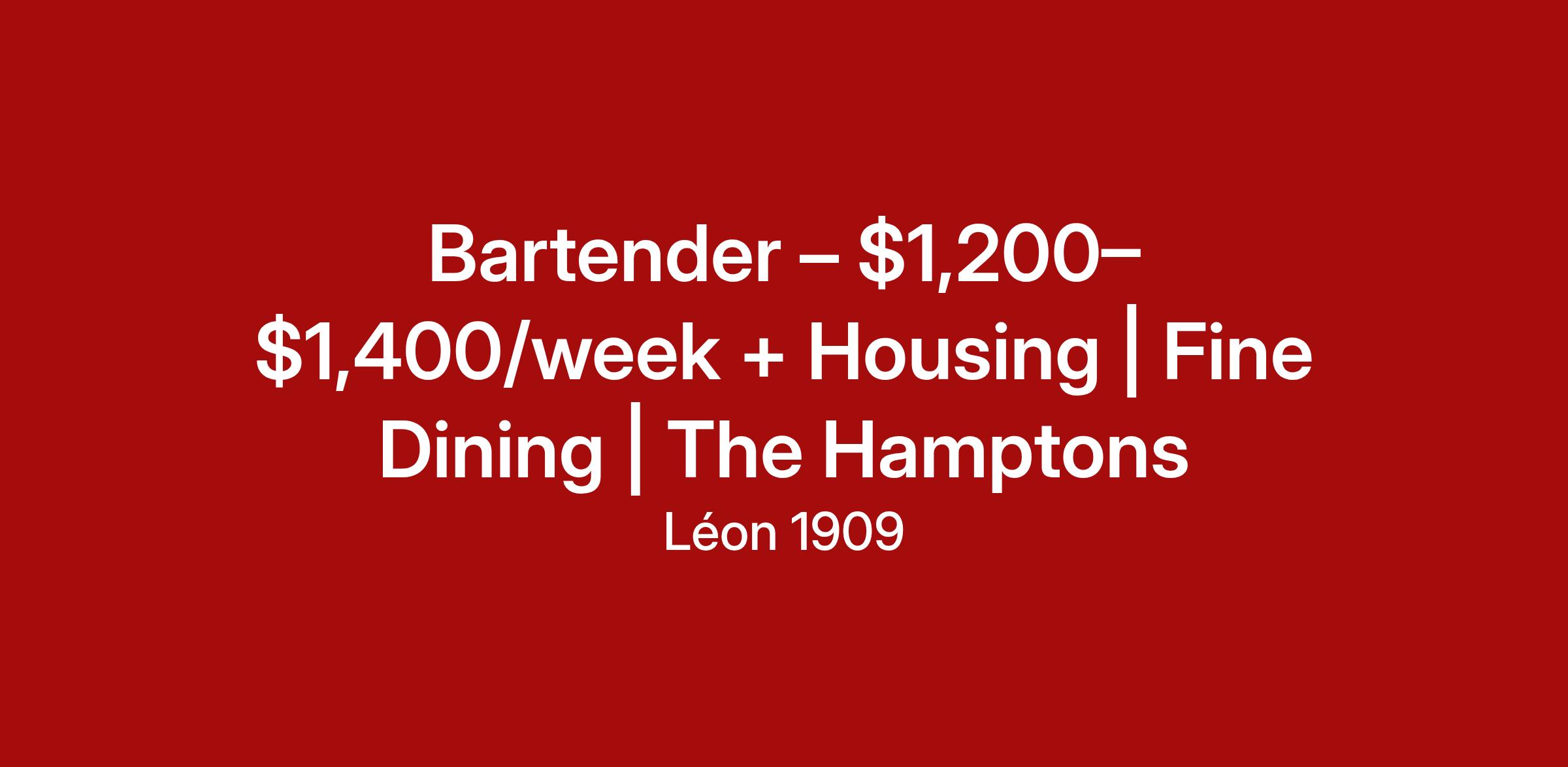 Léon 1909 is a polished French–Italian countryside restaurant in The Hamptons hiring a full-time Bartender for a refined, guest-focused dining environment. Enjoy weekly pay, strong earnings, a supportive culture, and staff housing available for $600/month (utilities included).