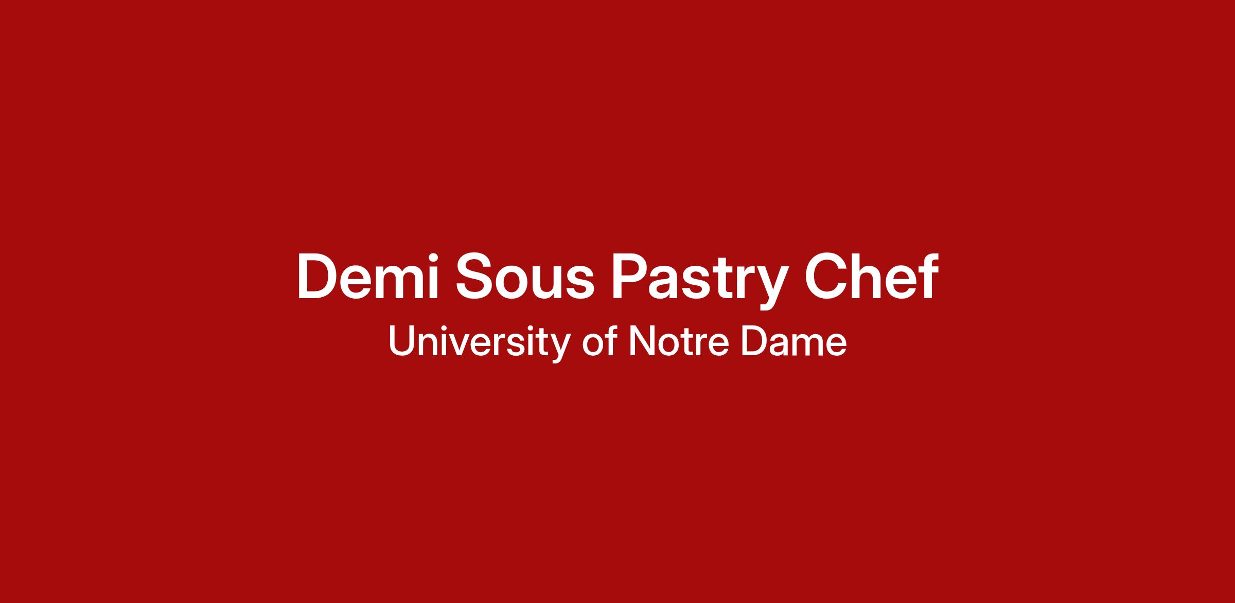 The University of Notre Dame Operations, Events, and Safety (UOES) division is currently hiring for a full-time Demi Sous Pastry Chef in our campus Hospitality department. The UOES division oversees the University's event management, hospitality, and customer service functions, while also supporting student life, academic initiatives, research activities, and annual milestone celebrations.