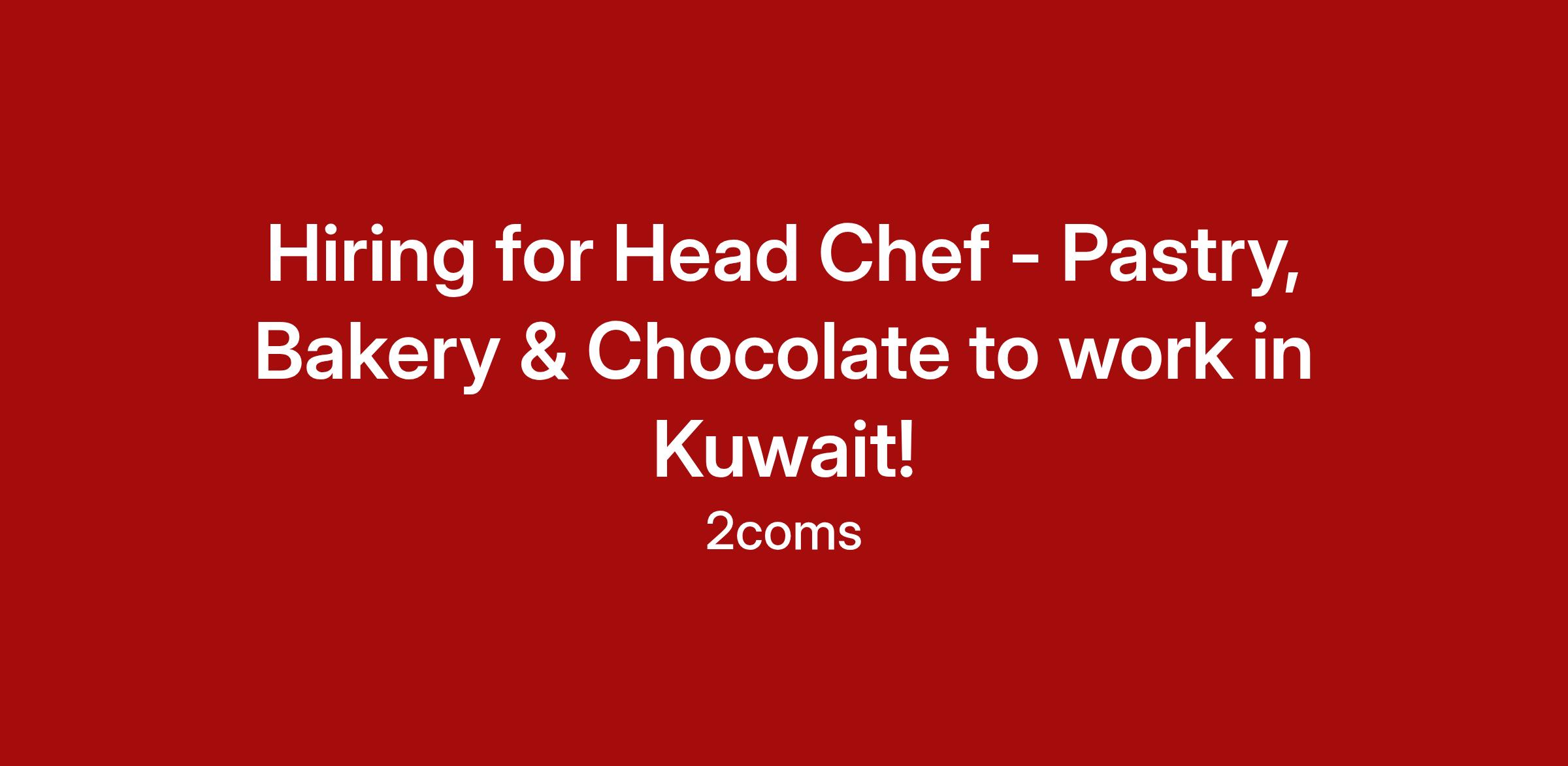 Excellent Job Opportunity for Sous Chef - Pastry, Bakery & Chocolate to work in Kuwait!<\/span><\/b><\/span><\/span><\/span><\/span> 3+ years of working experience as a Head Chef – Bakery or similar role Strong knowledge of bakery, pastry & Chocolate techniques<\/b> Ability to work in a fast -paced, high -volume kitchen environment Good communication and teamwork skills Physically fit and able to work long hours if required Age not exceeding 38 years<\/b> Competitive salary package Food allowance provided Opportunity to work in a professional kitchen environment in Qatar Career growth and skill development opportunities